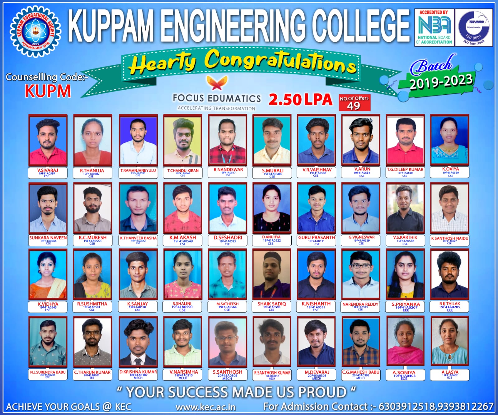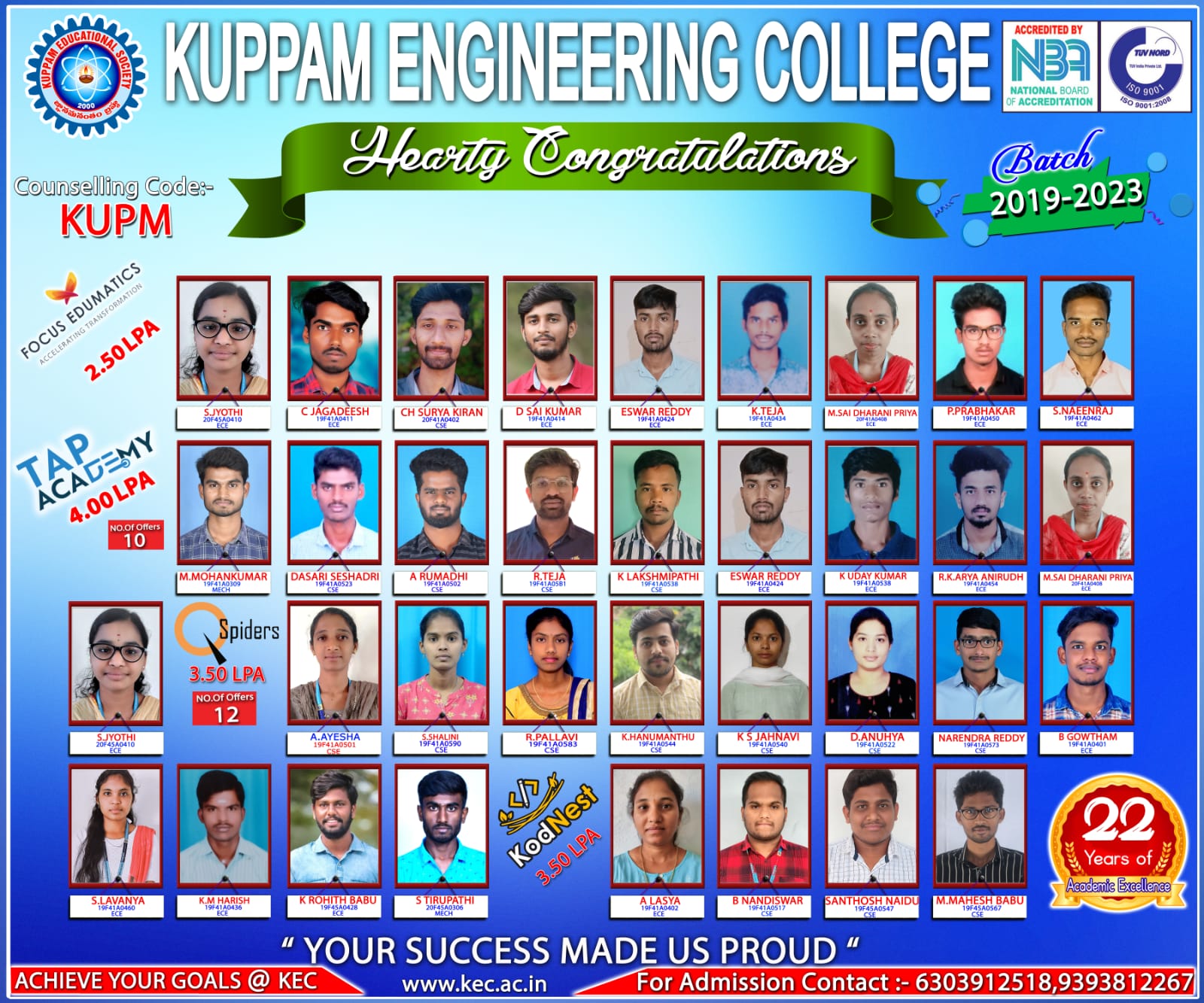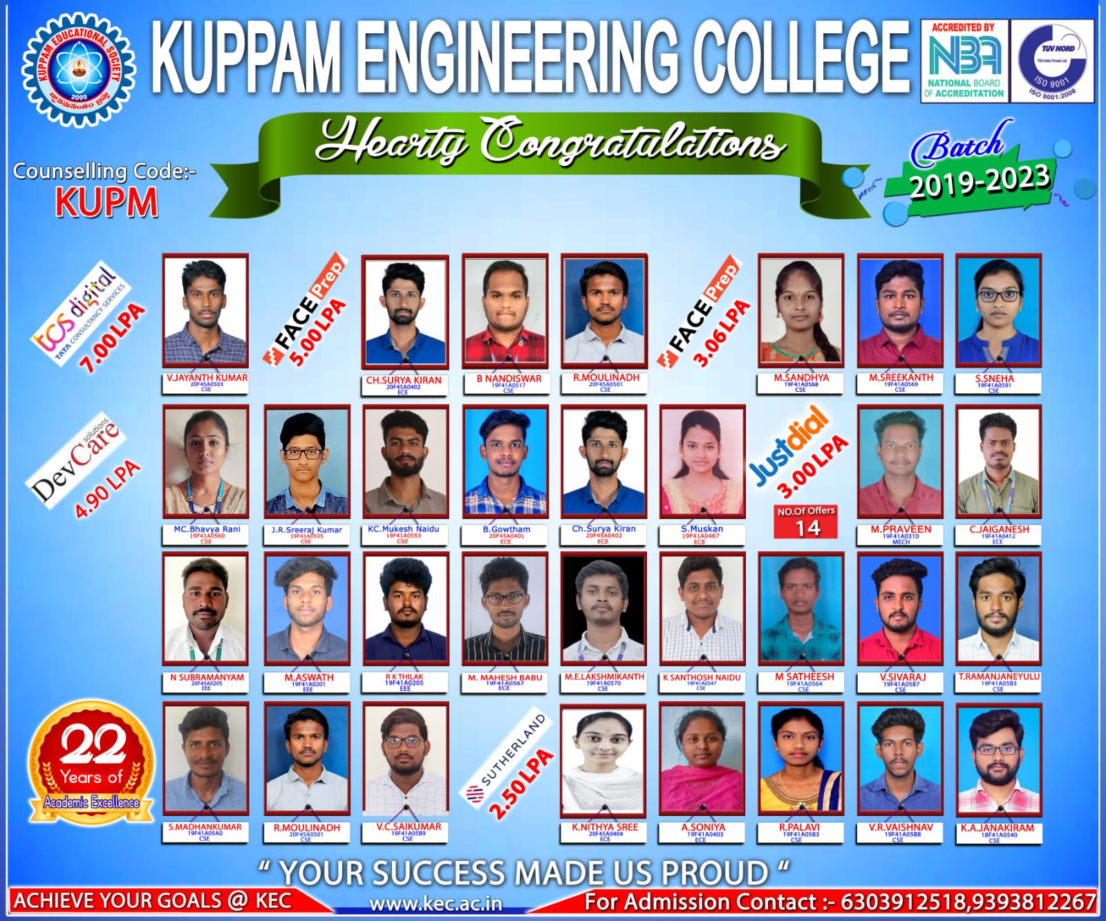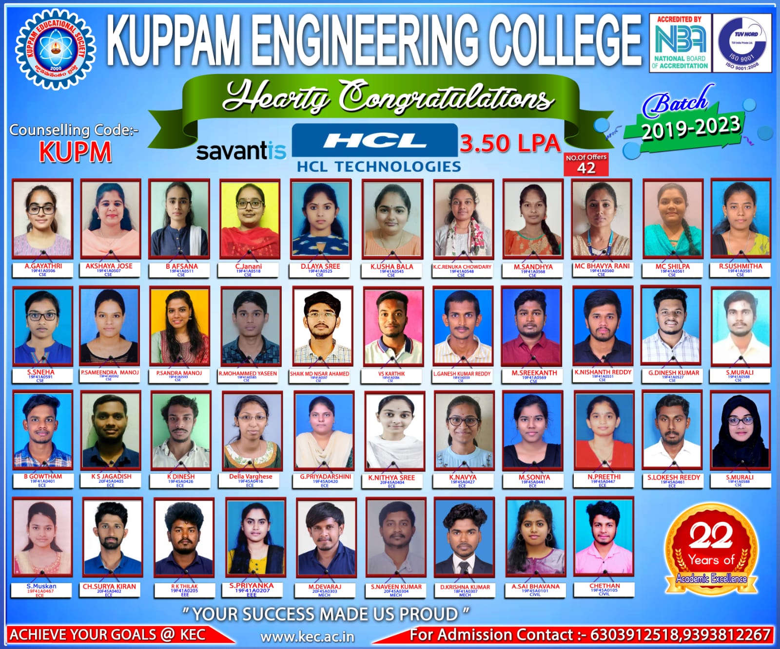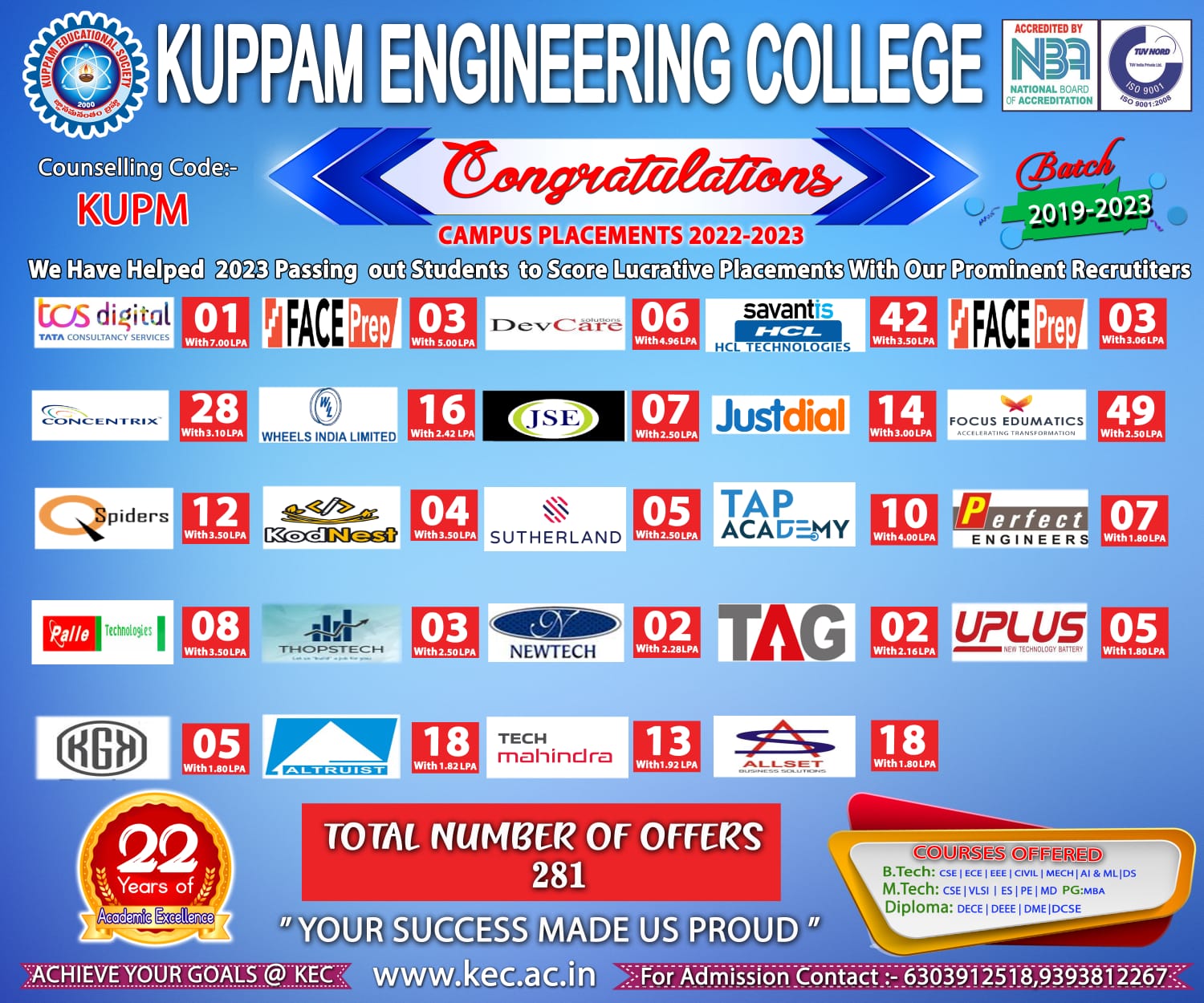 The Training and Placement cell of Kuppam Engineering College (KEC) forms an integral part in shaping the students careers of the institute. Our college provides a friendly and challenging environment in order to meet the demands of today’s competitive world. It organizes and coordinates campus placement program to fulfill its commitment of a job to every aspirant.